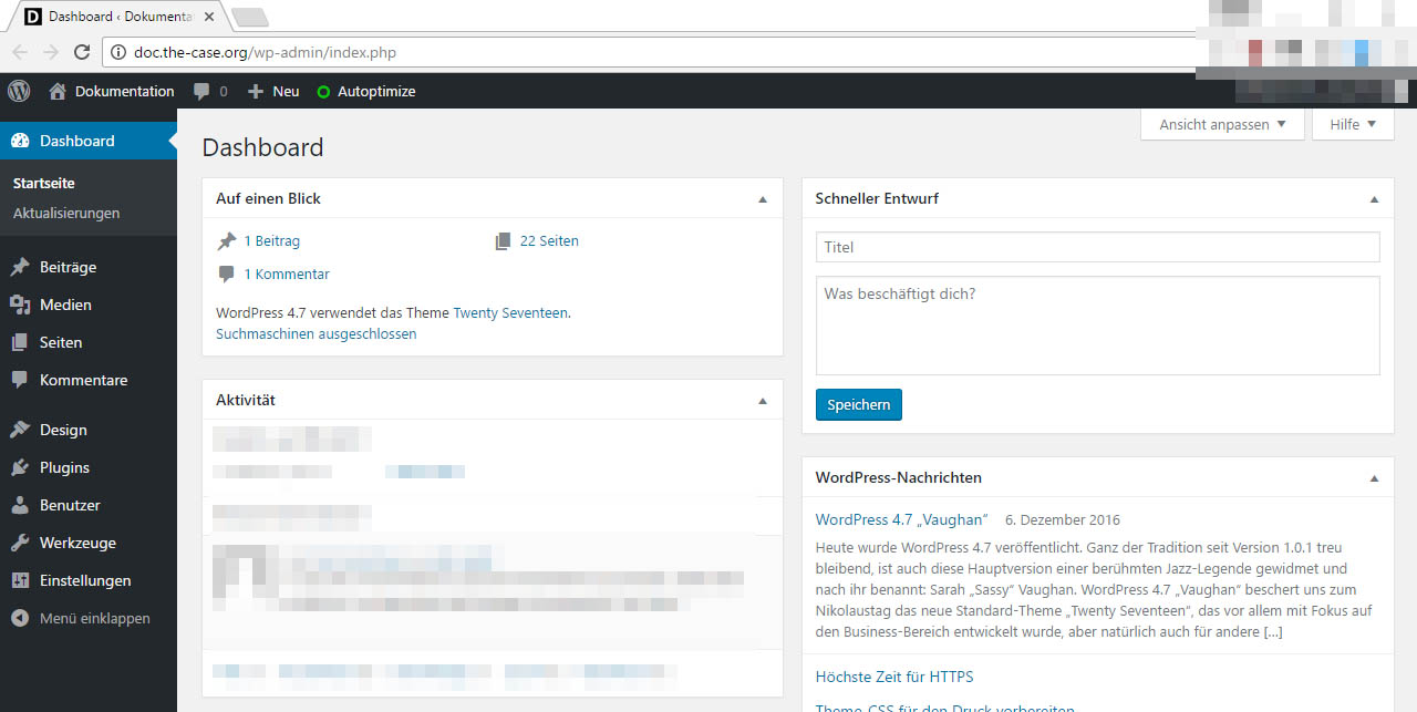 Nach dem Login werden Sie automatisch zum Dashboard im Backend weitergeleitet. Von hier aus können alle Funktionen der Seite verwaltet werden.