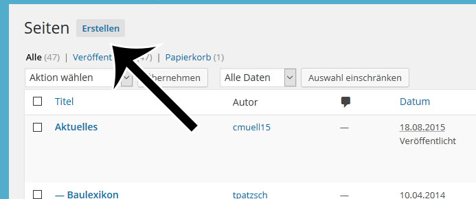 Um eine neue Seite zu erstellen, müssen Sie im Backend unter Seiten > Alle Seiten auf den Button Erstellen klicken.