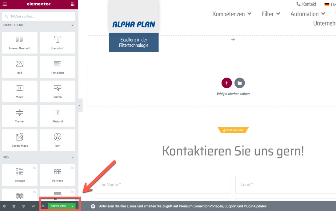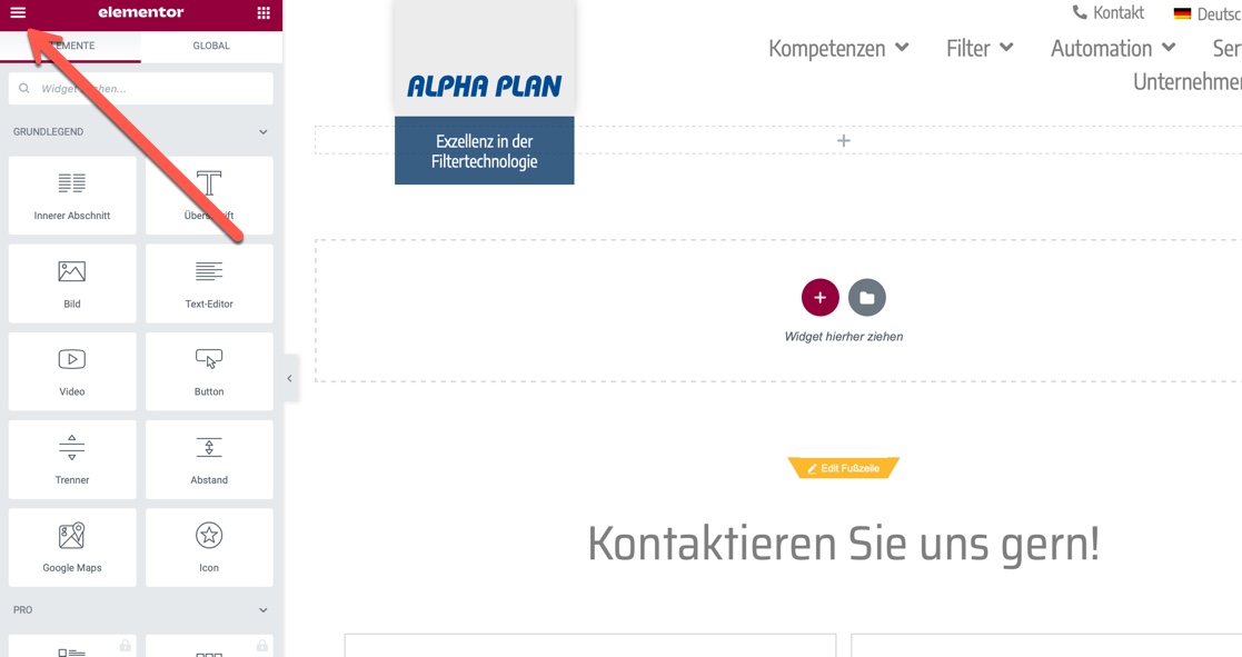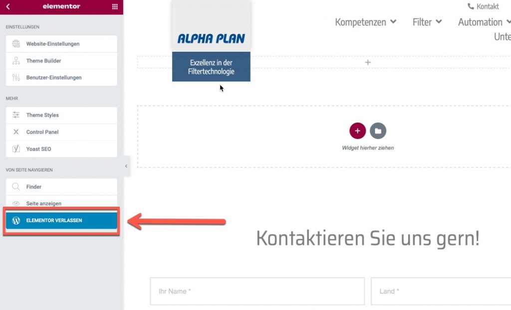 - Sind Sie mit dem Bearbeiten der Seite fertig, wählen Sie das Menü in der linken oben Ecke aus und klicken auf „Elementor verlassen“