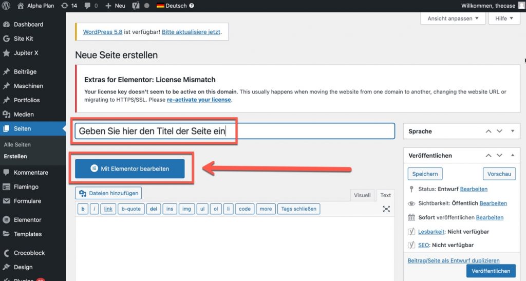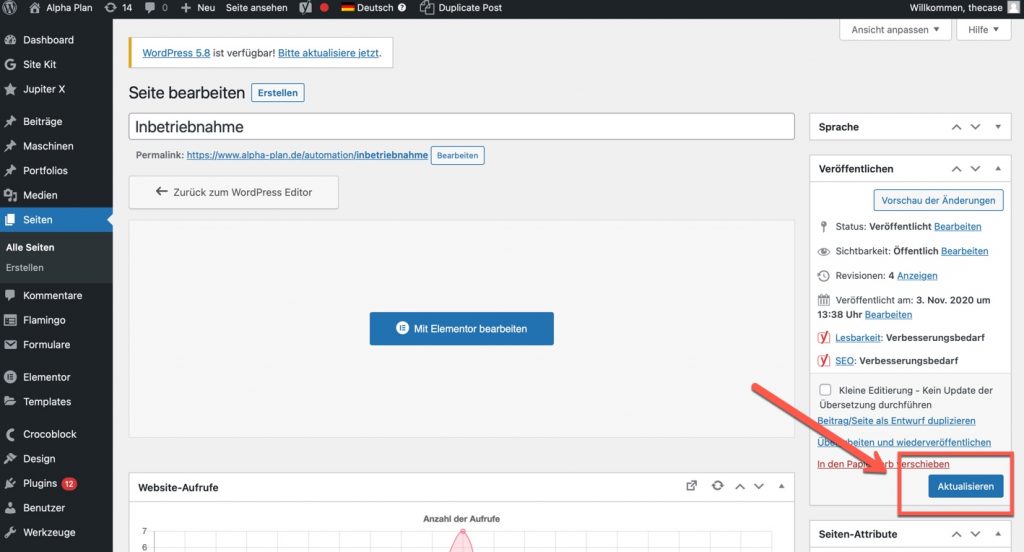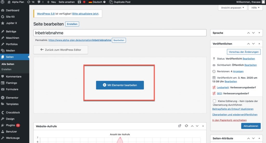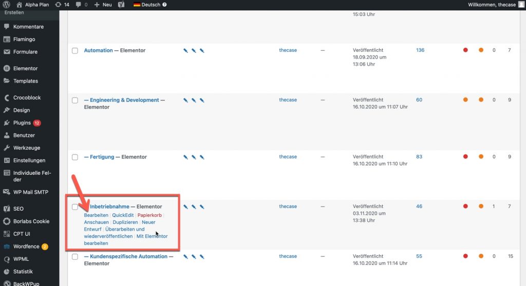 - Klicken Sie auf „Mit Elementor bearbeiten“ und nehmen Sie die gewünschte Bearbeitung vor