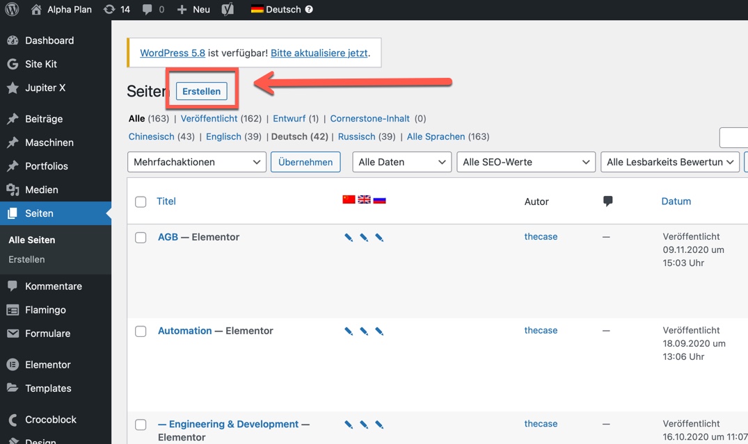 - Der Menüpunkt „Seiten“ ist nun Ihre Basis für jegliche Bearbeitung und Neuerstellung von Seiten. Auch die Übersetzung der Inhalte in andere Sprachen wird von hier aus ausgeführt.