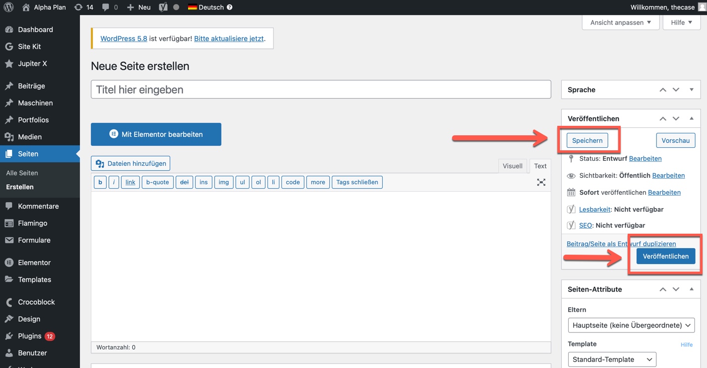 - Möchten Sie die Seite lediglich als Entwurf speichern und später veröffentlichen, klicken Sie auf den kleinen Pfeil neben dem Wort „Speichern“ und im sich öffnenden Menü auf „Als Entwurf speichern“ – hier findet dann keine Veröffentlichung statt