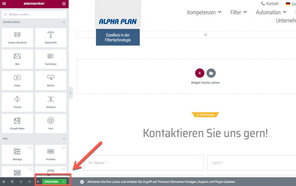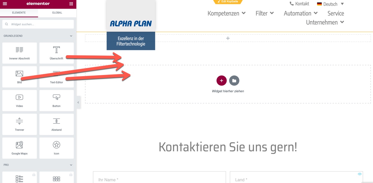 - Gestalten Sie Ihre Seite mit den Elementor-Elementen. Ziehen Sie diese per Drag&Drop an die gewünschte Stelle und befüllen Sie mit Inhalt