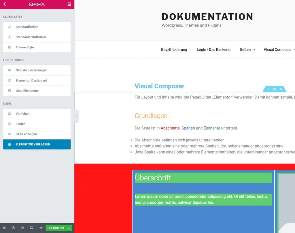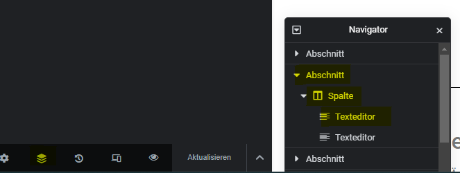 In dieser Übersicht können die Elemente, Spalten und Abschnitte (oder Container) auch per Drag-and-Drop bewegt werden.
