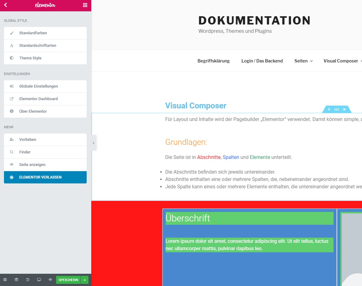 Die Seite ist in Abschnitte, Spalten und Elemente unterteilt.