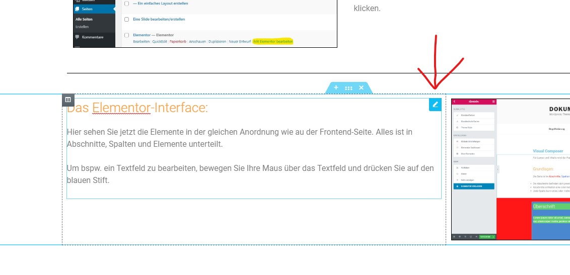 Meistens reicht, um das Bearbeitungsfenster in der linken Sidebar zu öffnen, auch ein Klick direkt auf das Element. Mit dem Stift gehen Sie aber auf Nummer sicher, dass Sie das richtige Element ausgewählt haben.