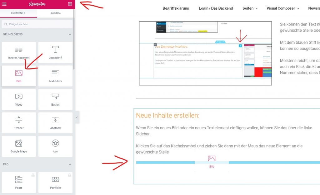 Wenn Sie ein neues Bild oder ein neues Textelement einfügen wollen, können Sie das über die linke Sidebar tun.